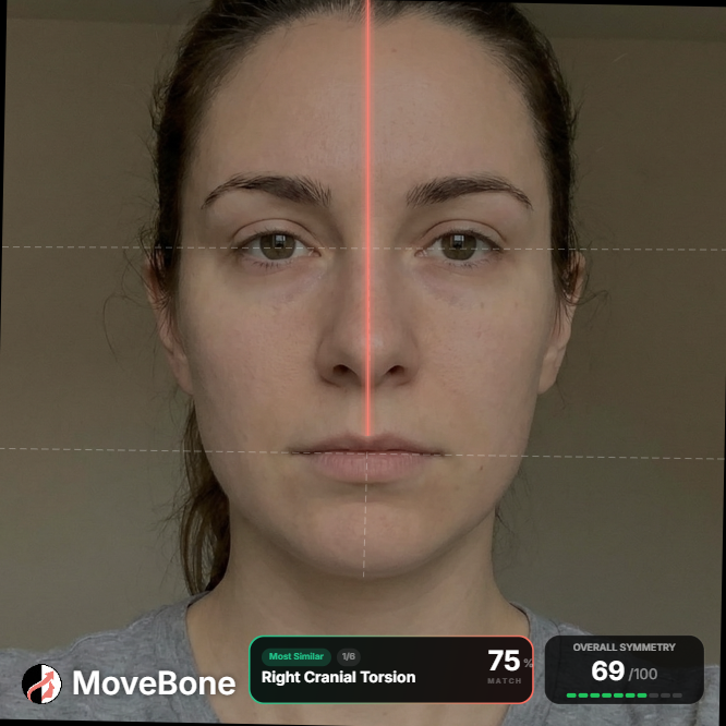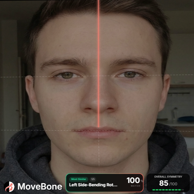 Your brain shows you a flipped version in the mirror — the face trained into your memory. Cameras reveal the real, un-reversed face everyone else sees. MoveBone quantifies the deviation, identifies the structural root cause, and builds a corrective protocol your bones actually respond to.